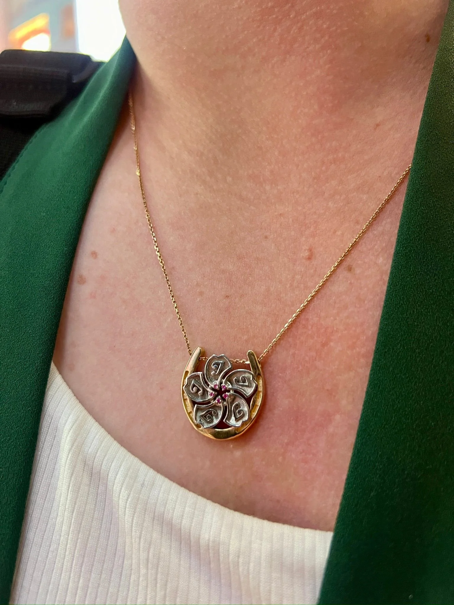 This 14k gold and platinum necklace was made custom for our sister and features a combination of all things uniquely her. Her love for horses and Japan inspired us to create a horseshoe design that surrounds a beautiful sakura blossom, inset with Pink Sapphires to really make it pop.
